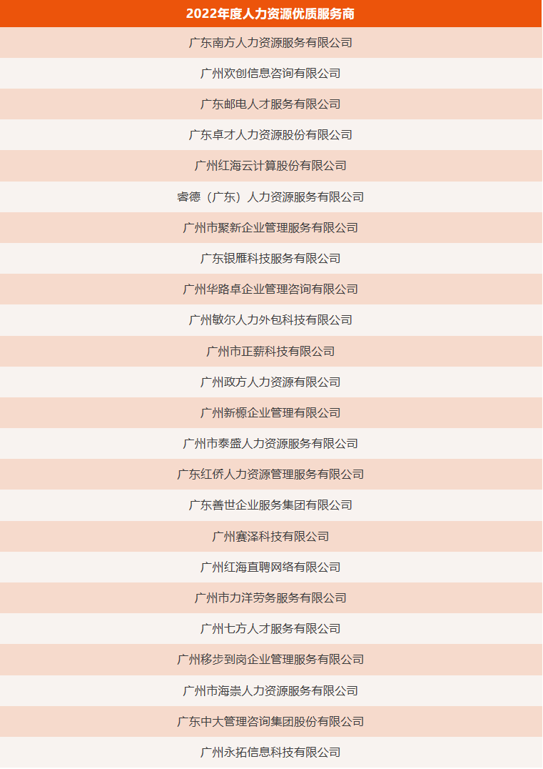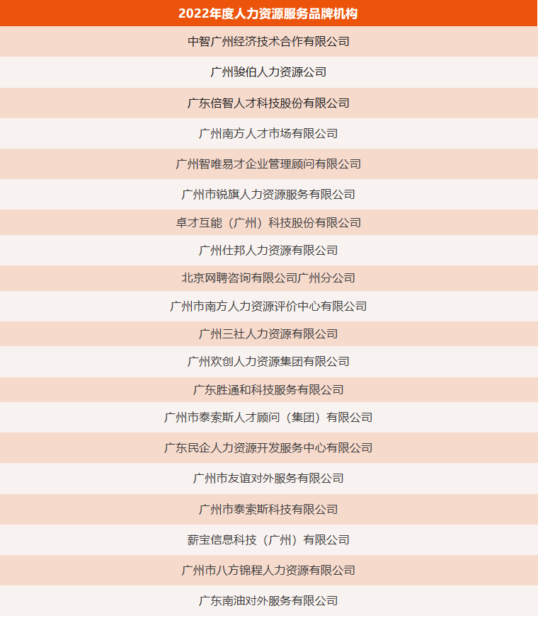 根据《关于开展2022年度人力资源服务评选活动的通知》(穗人协〔2022〕17号)要求,经自愿申报、资格审查、专家评审、社会公示等程序,确定了20家2022年度人力资源服务品牌机构、25家人力资源优质服务商、38家优秀会员单位及16名人力资源服务先锋人物,现予以公布,具体名单见附件。